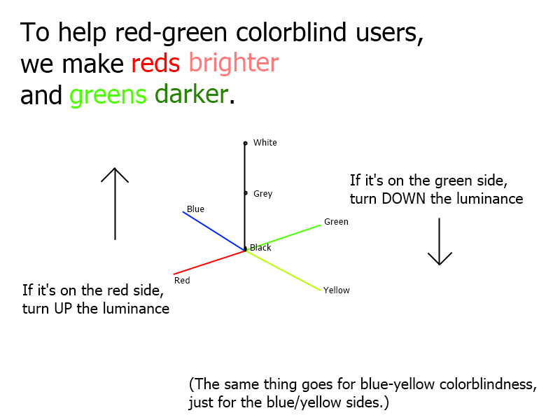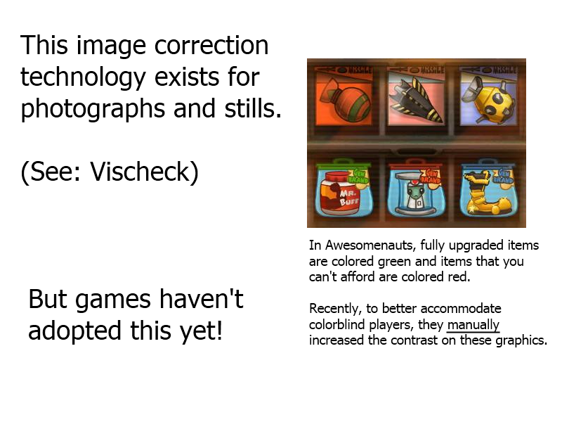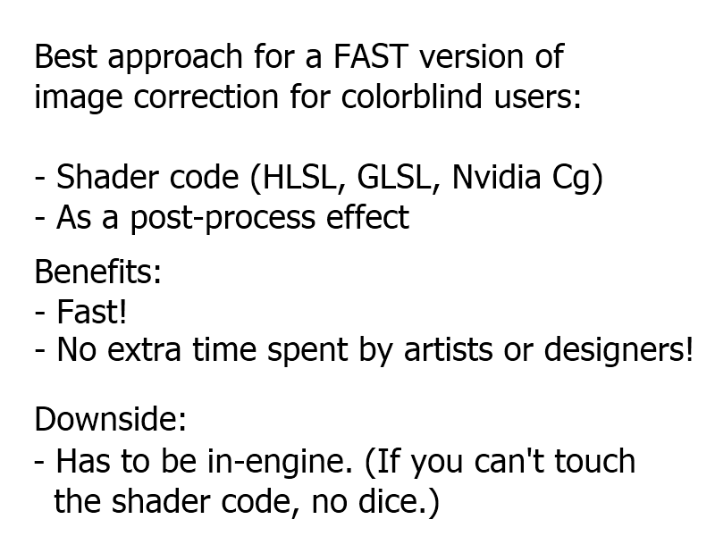 - Most games with a “colorblind mode” swap hard assets – meshes, textures, etc.